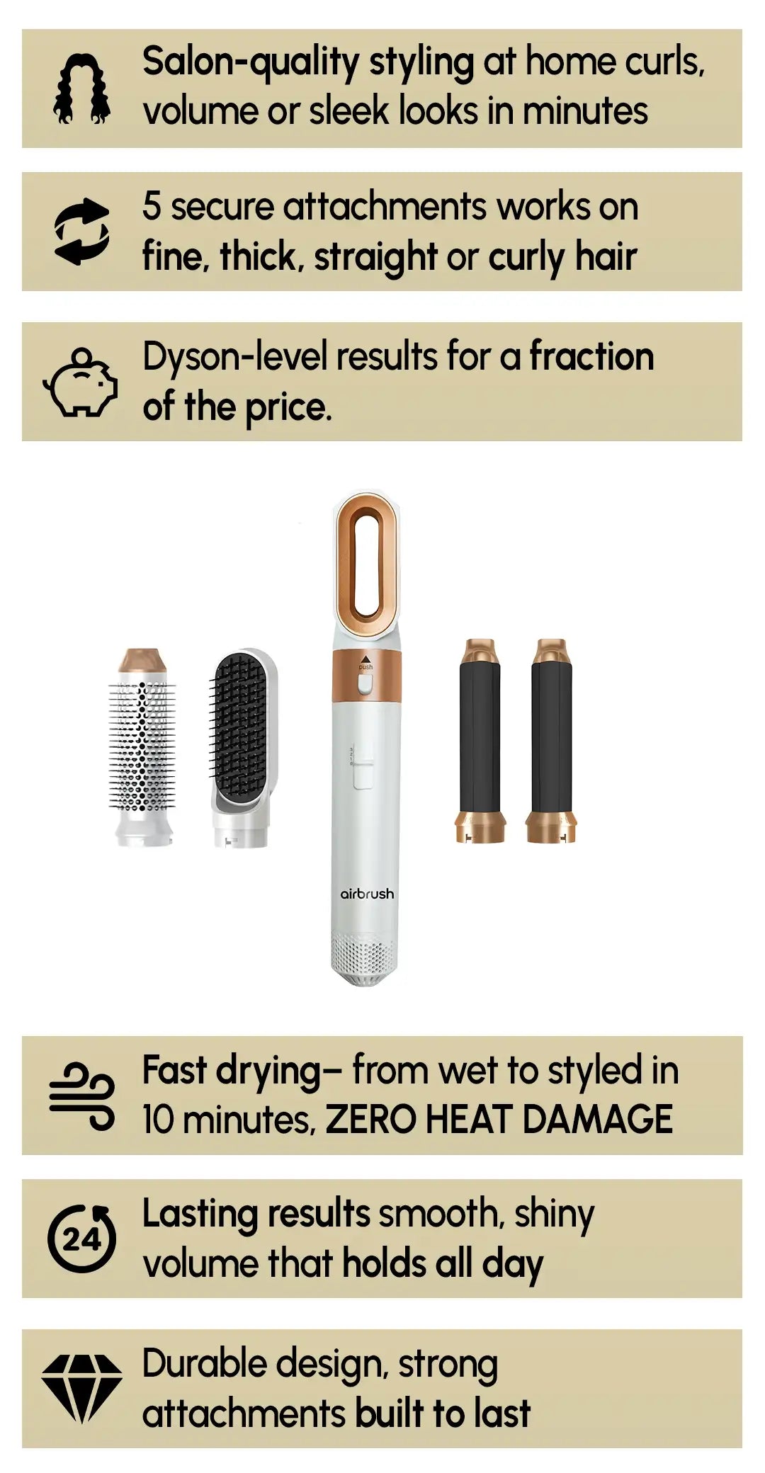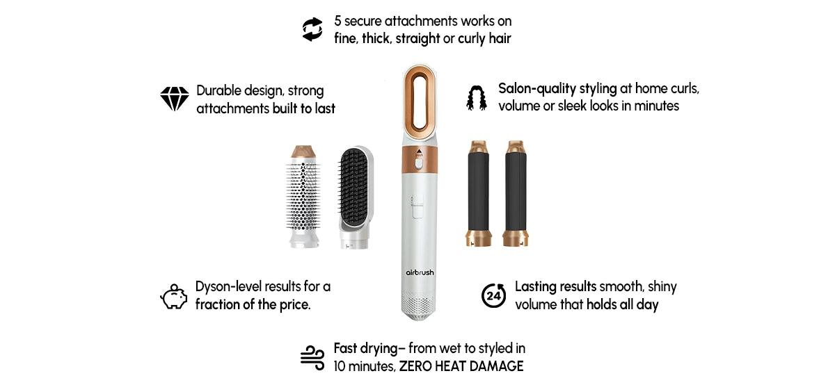 The 5-in-1 Multi Styler comes with several interchangeable attachments: curling iron, smoothing brush, heated comb, etc.